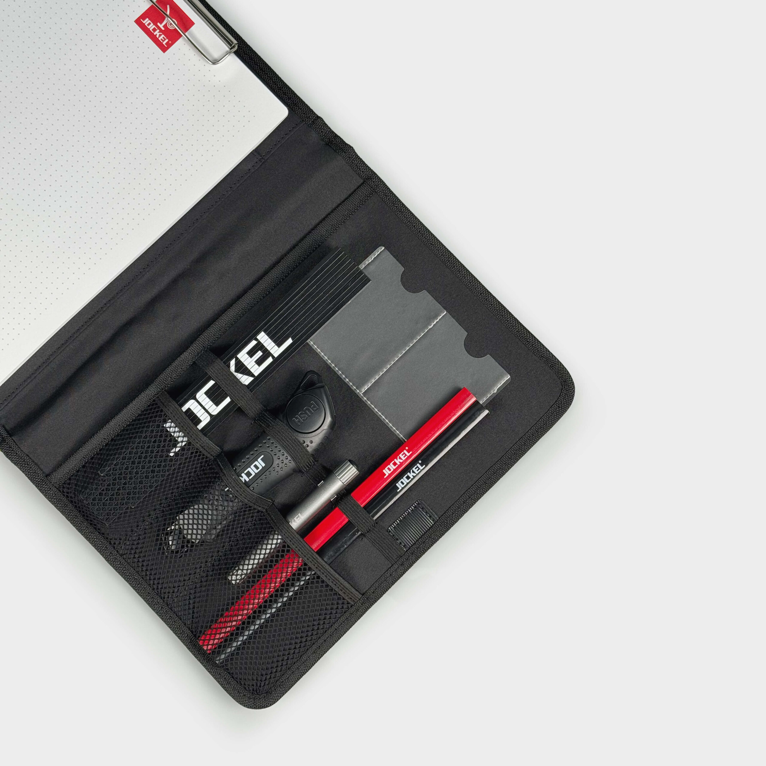 Die JOCKEL Handwerkermappe ist der ideale Begleiter für deinen Arbeitstag – ob bei Wartungen, Montagen oder Heimwerker-Projekten. Durchdacht, robust und vielseitig einsetzbar ist sie ein echter Allrounder im Arbeitsalltag. Erhältlich einzeln oder als modulares Set, lässt sie sich perfekt mit unseren schwarzen Zollstöcken, hochwertigen Softtouch-Cuttermessern, Zimmermannsbleistiften, Kugelschreibern und original JOCKEL-Notizblöcken kombinieren. Geeignet für Tablets bis 11 Zoll.